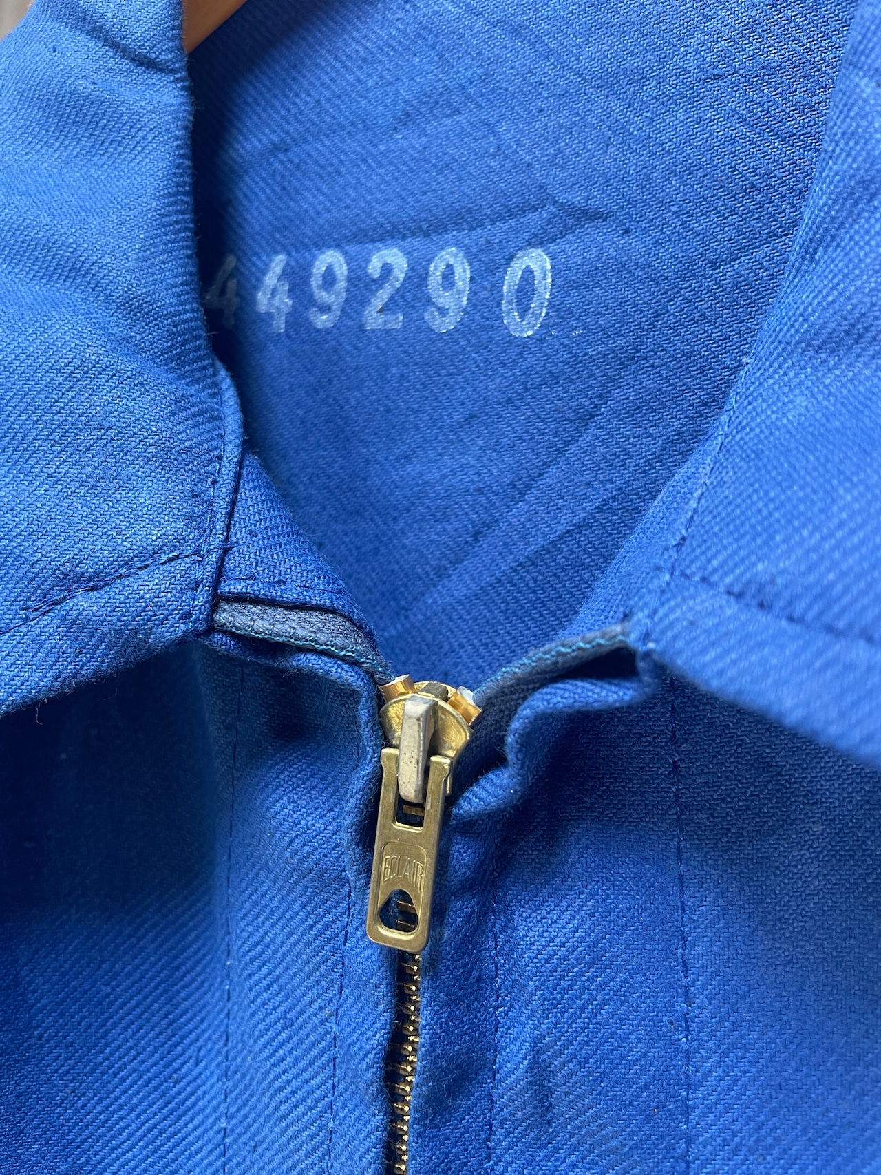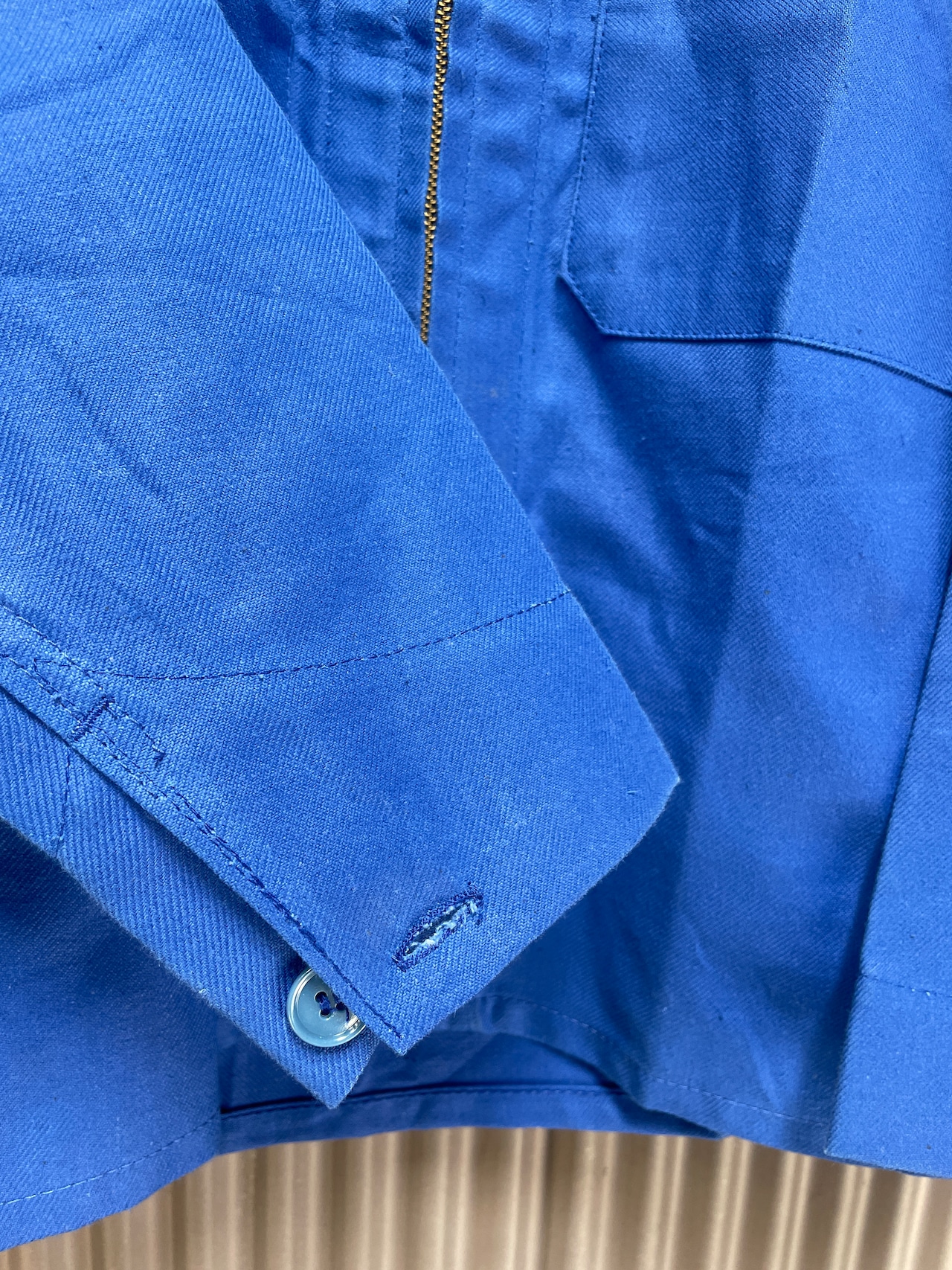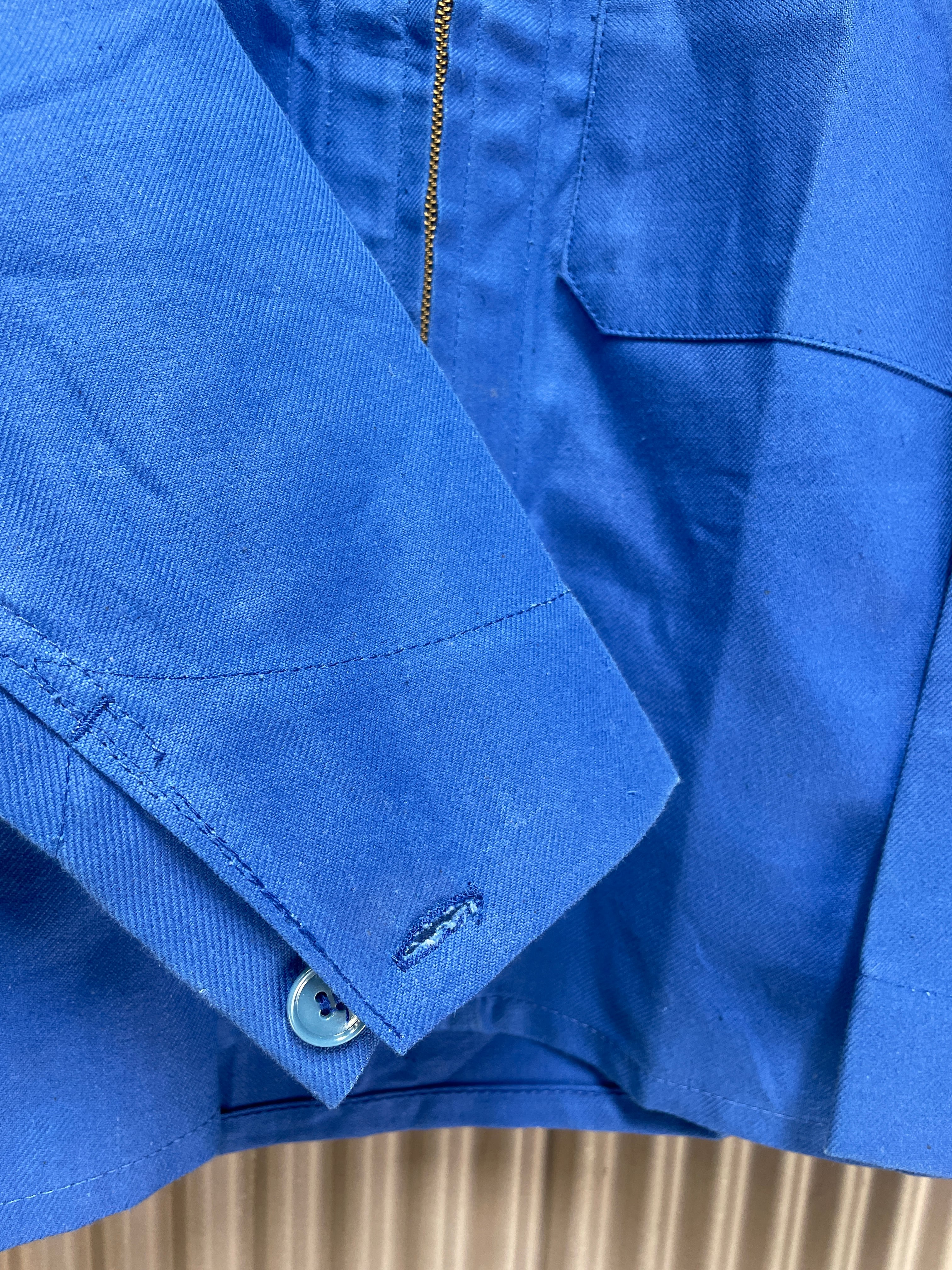 鮮やかなインクブルーが印象的な、1960〜70年代頃のフランス製メカニック用ワークジャケット。マルタン・マルジェラにもサンプリングされた八の字ジップ仕様。デッドストックの未使用品です。