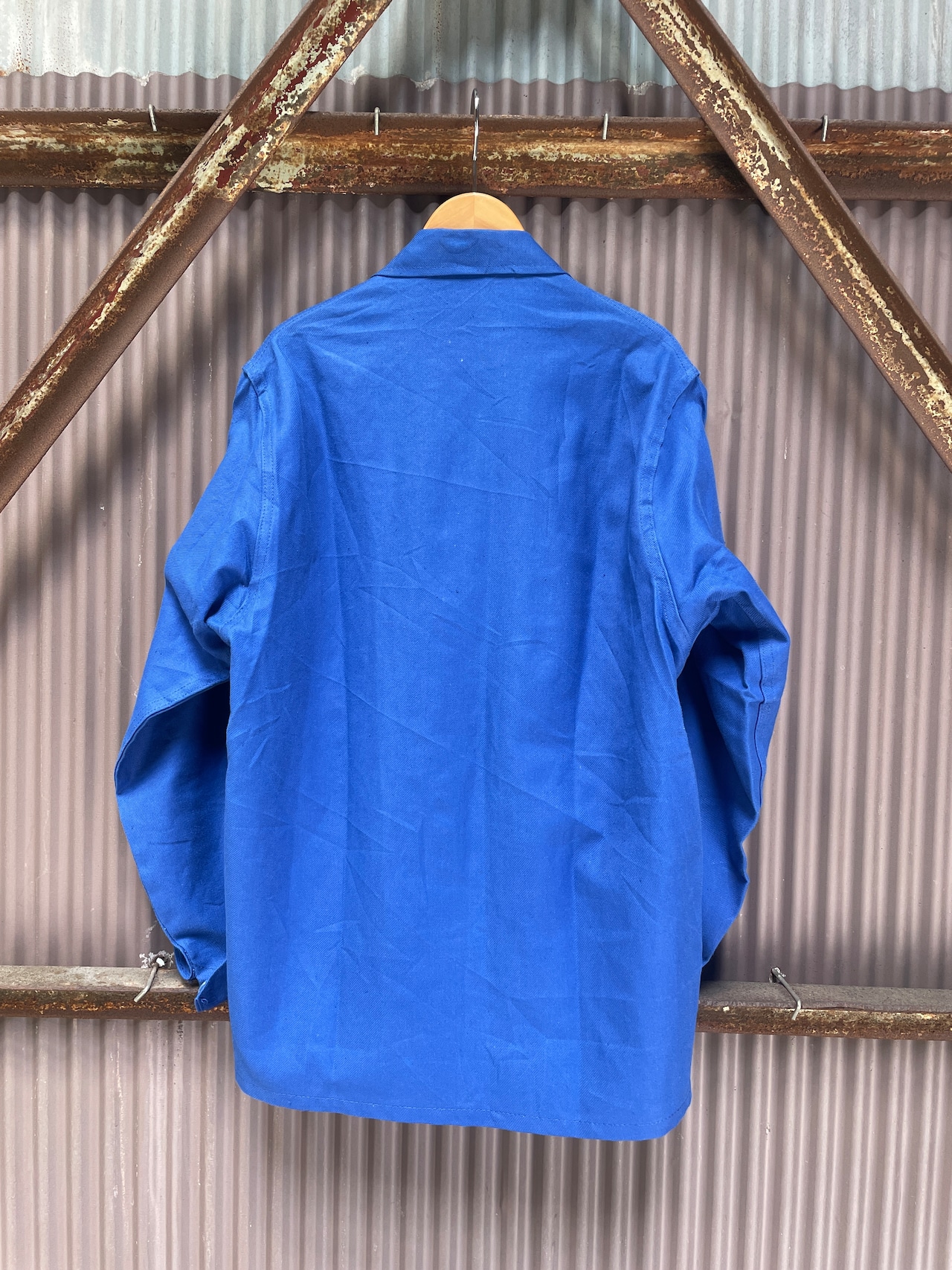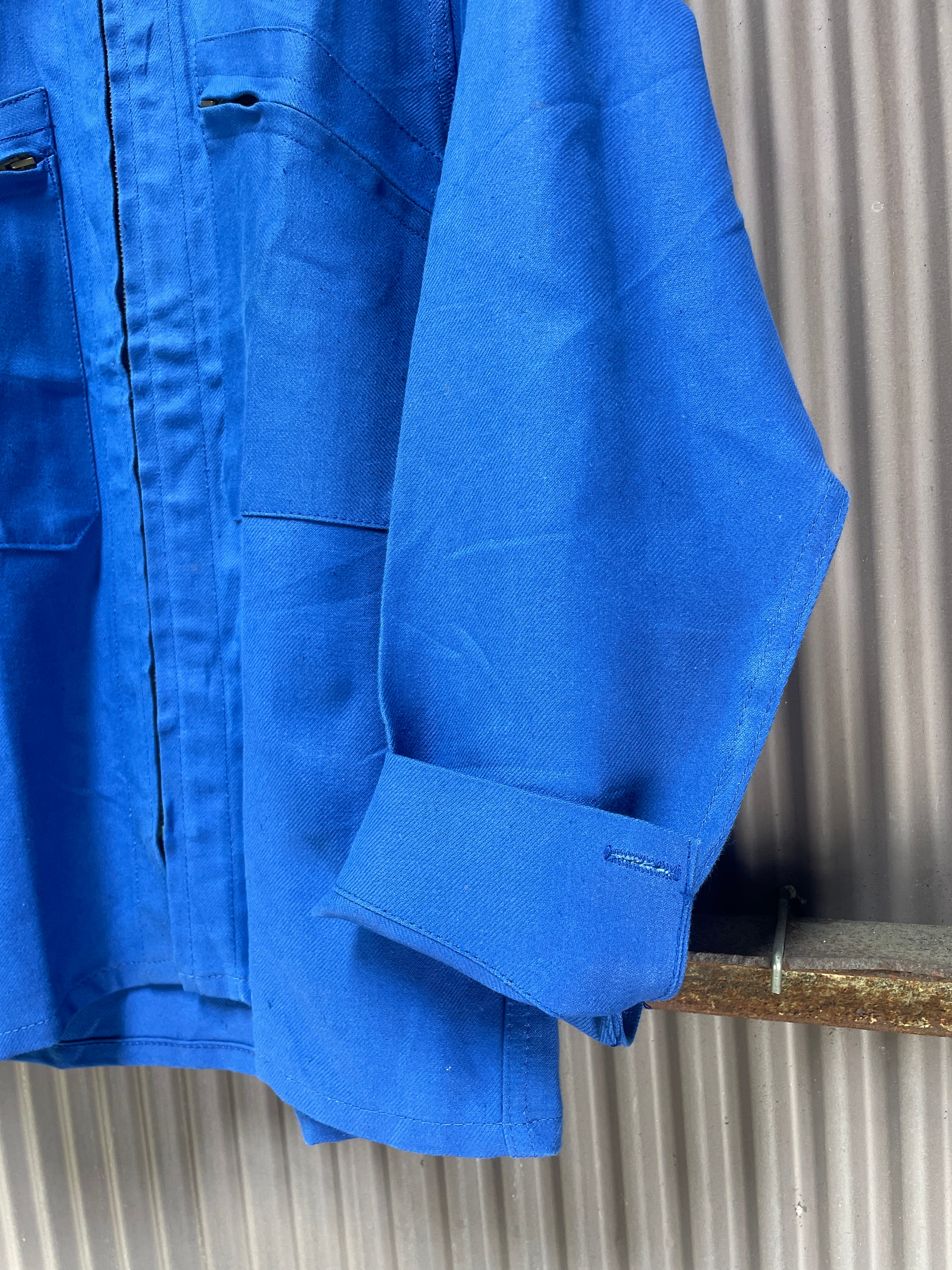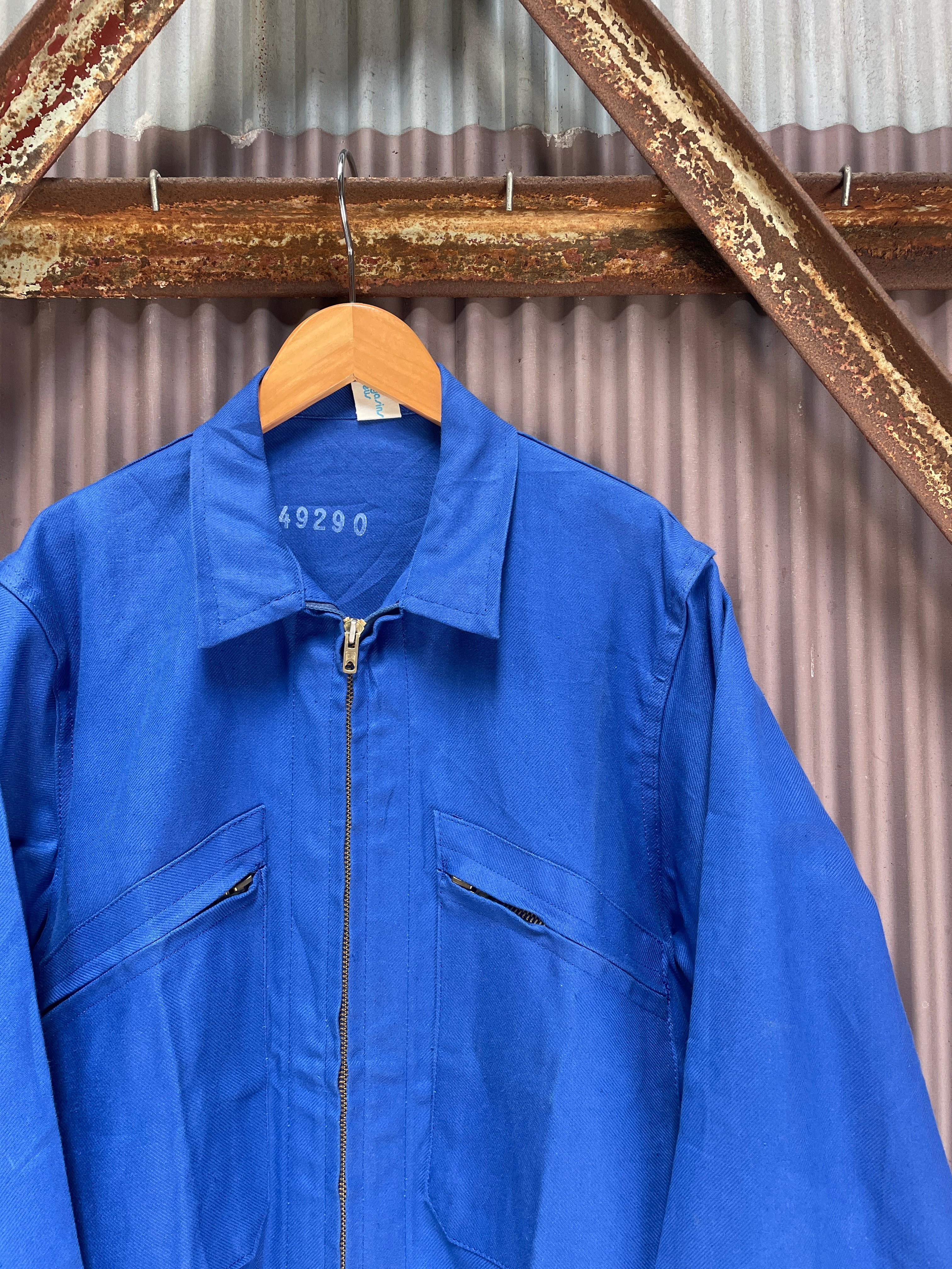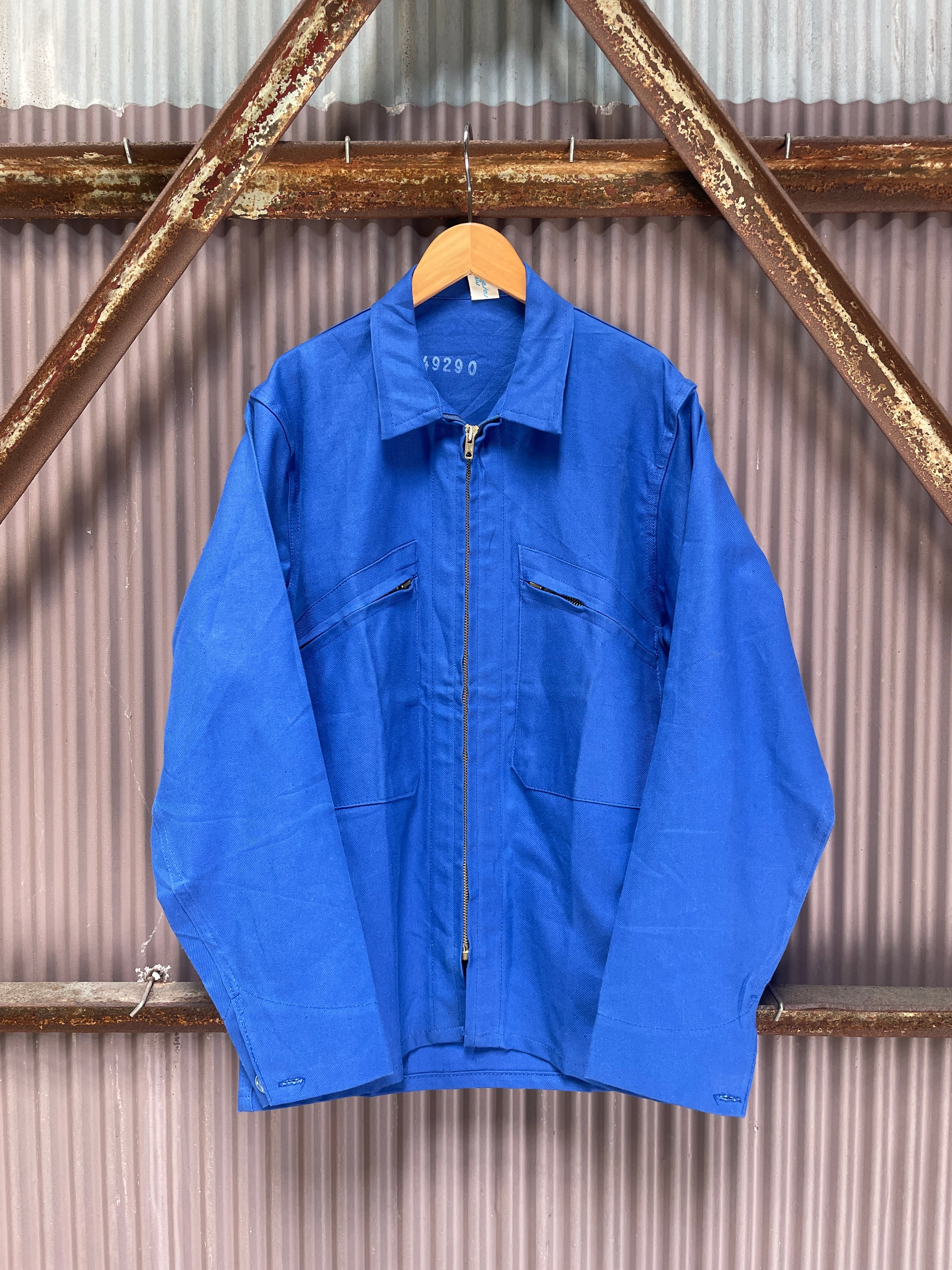 鮮やかなインクブルーが印象的な、1960〜70年代頃のフランス製メカニック用ワークジャケット。マルタン・マルジェラにもサンプリングされた八の字ジップ仕様。デッドストックの未使用品です。